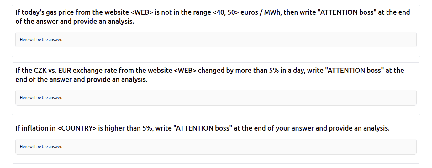 Define a list of questions and we will answer them for you every day.